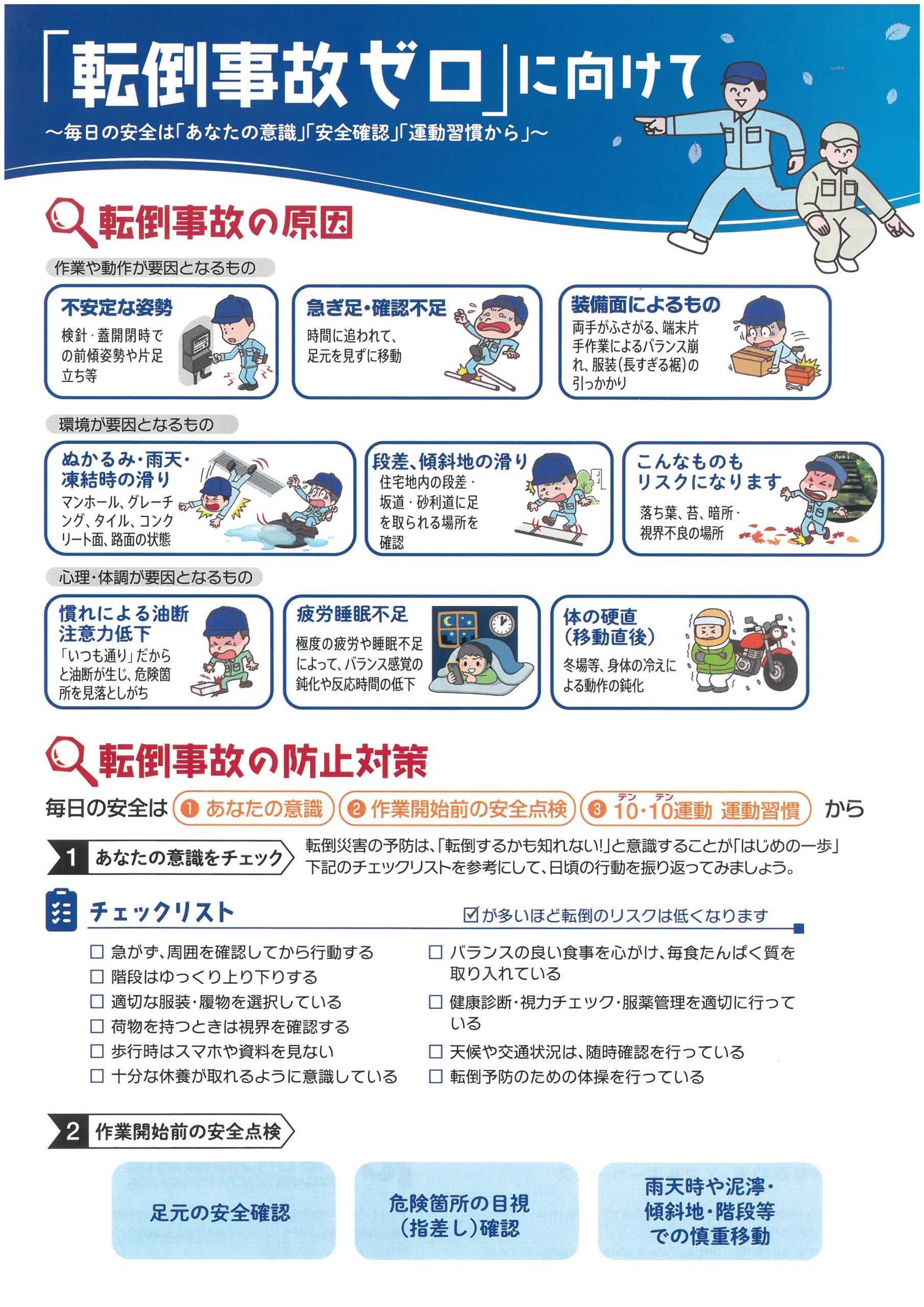 作業を行う際に、安全な場所で身体をほぐし、体を慣らすための軽い運動を行うことで、転倒リスクを低減することが出来ます。